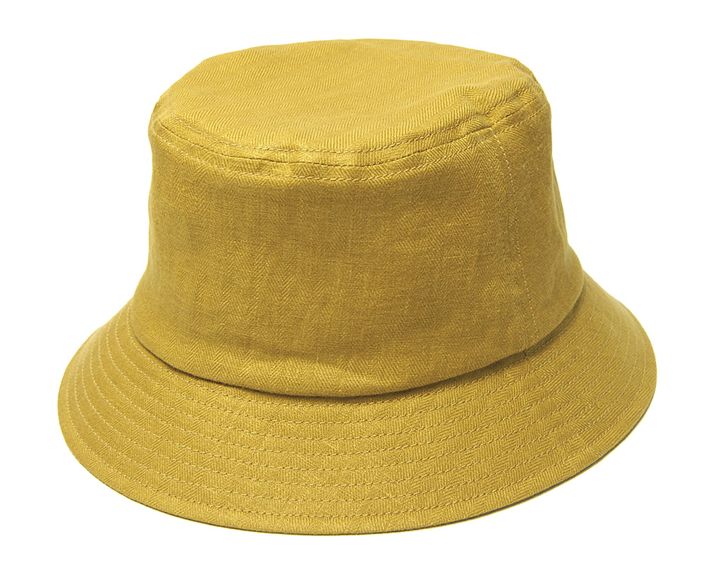 この帽子は、ヘリンボーン織り柄のリネン生地を使ったバケットハット。