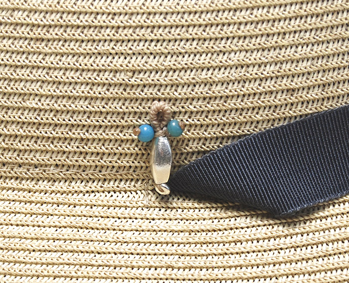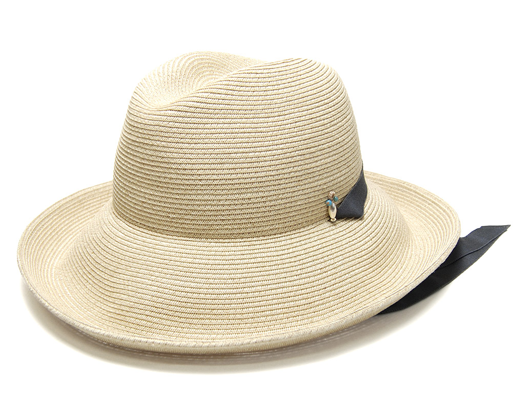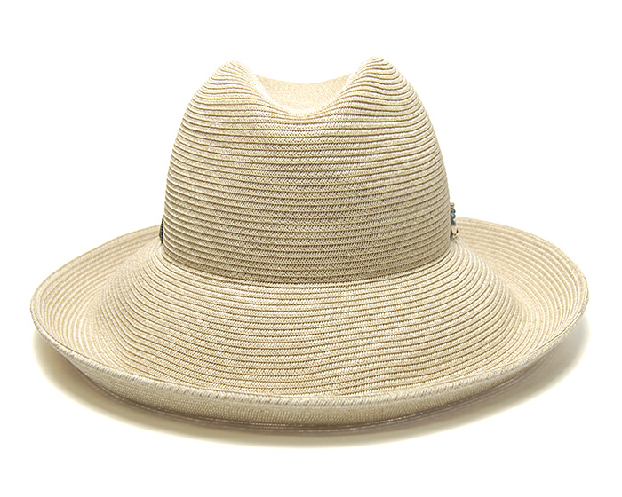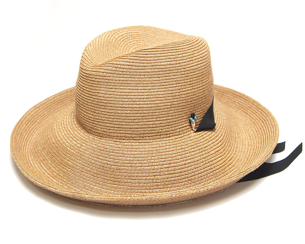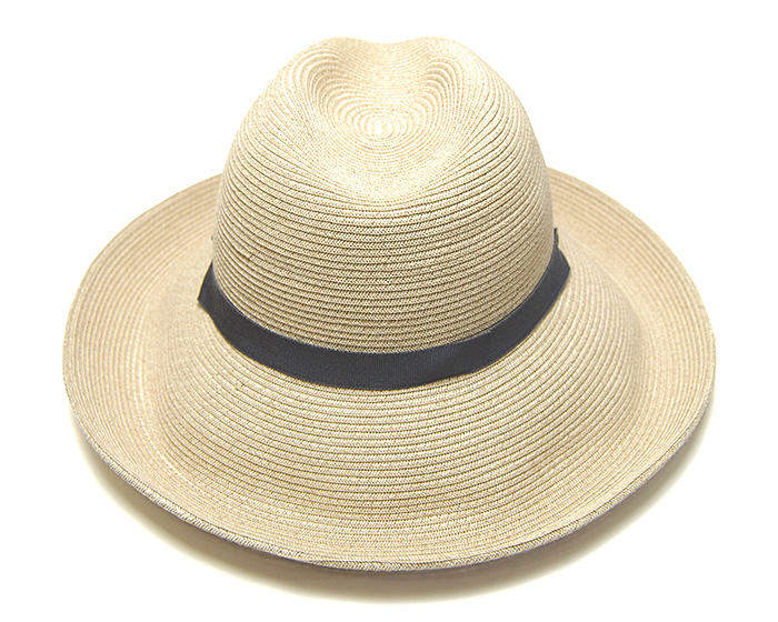 質感の良い紐状のブレードを緻密に縫い上げた中折れ帽タイプのハット。