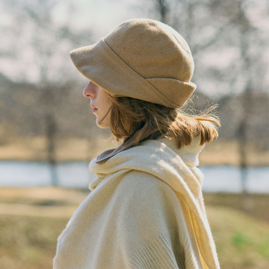 ウールにカシミアをミックスした素材は、ソフトで弾力性に富み、形を変化させやすくおさまりが良いのも特徴で