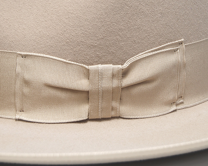 比較的垂直に立ち上がった形状のハイクラウン・つば広・太目のリボンにつば先パイピングと
